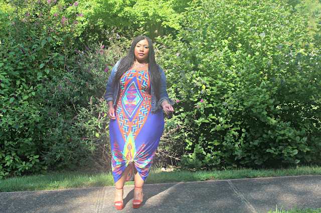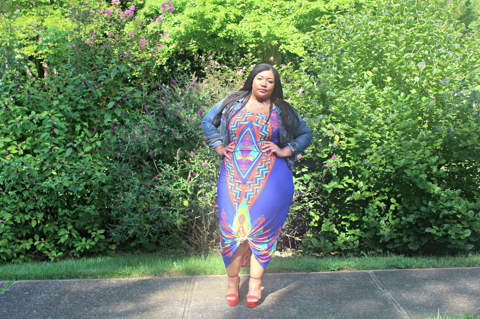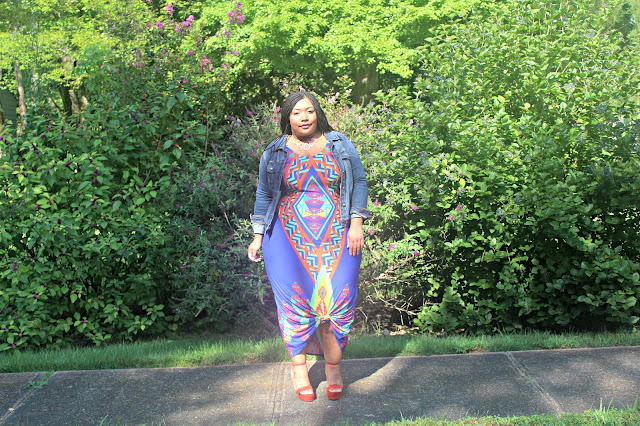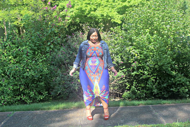 This dress reminded me why I am such a “dress” girl. This Maxi Multicolor Tribal Print Dress is everything and more. The colors are vibrant, the length is on point, and did I mention this dress comes in black?! Yes it does! This maxi is sleeveless so I decided to add my favorite denim jacket and super comfy heels. I can definitely see myself adding sneakers and a denim top to wear this dress to a football game.