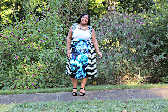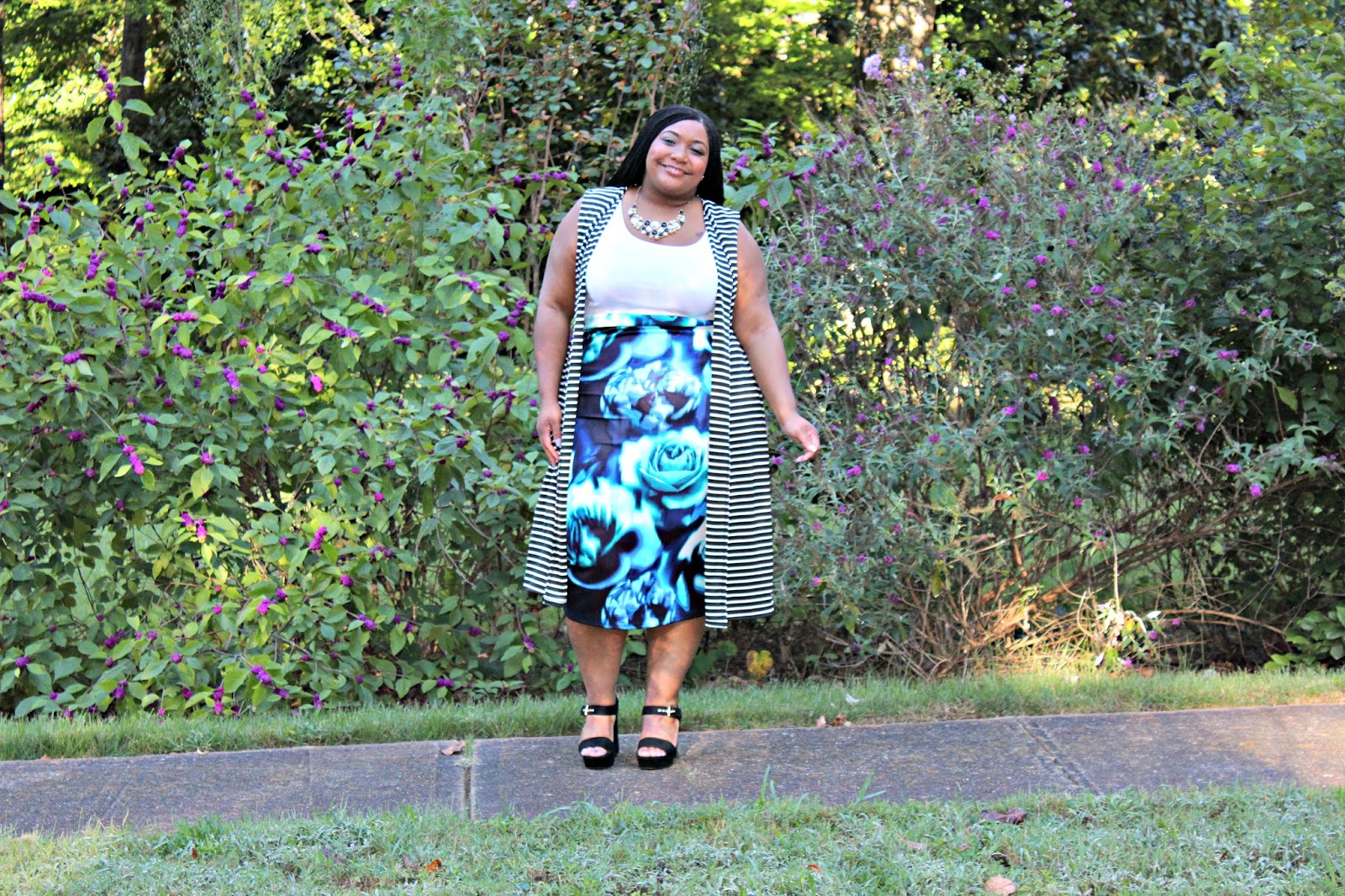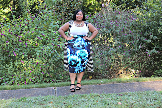 This outfit is very special for me, because I combined two outfits the Rose Print Ankle Tube Dress and the Long Stripe Vest & Straight Pants Set. I made the dress a skirt to add length and I took the vest from the set to add a pattern. This had to be my favorite look, because I love mixing prints. I completed this look by adding a simple tank and black sandals.