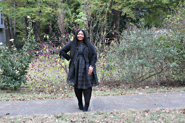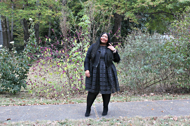 I am a huge fan of awesome dresses and this dress from Nextmia is nothing short of fabulous! Here’s a little background information on Nextmia, they “sell some of today’s most edgy fashion, and provide all kinds of stunning plus size fashion, including dresses, swimwear, tops, outerwear, bottoms and lingerie, making Nextmia.com the go-to online fashion store to get your chic fix. For those plus size and fashion-chasing ladies, we’ve got you covered.” When I saw this dress I immediately knew I wanted to black this look out. I added my favorite tights, black booties, and my bomber jacket to create texture.