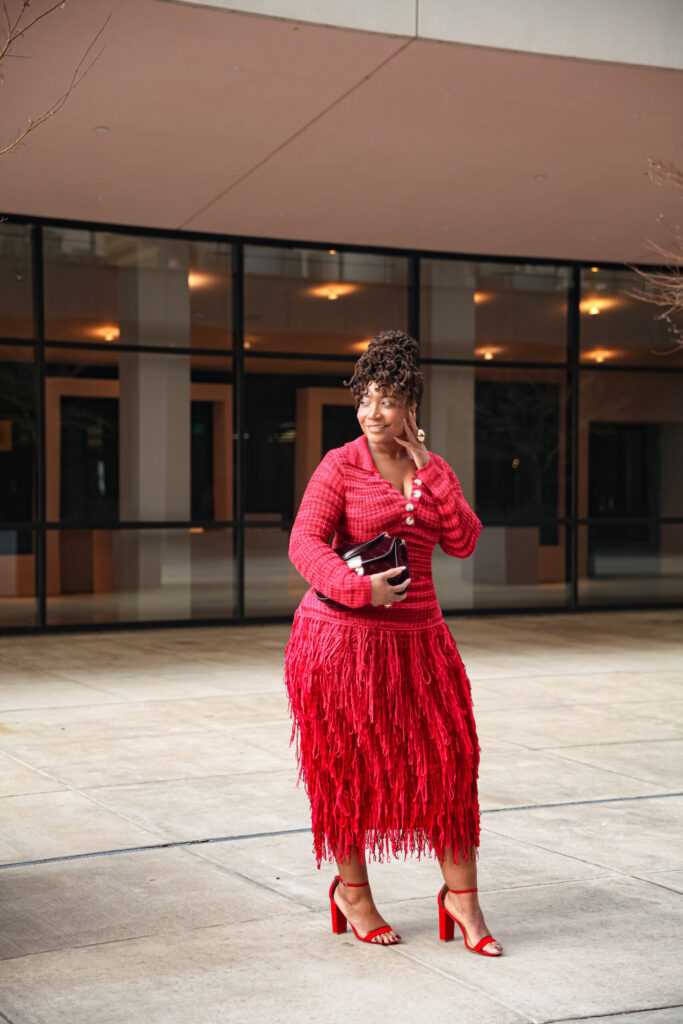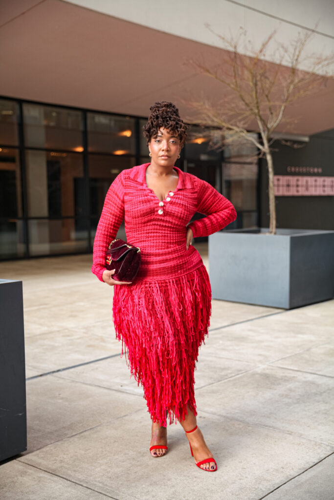 Throughout this series, I’ll be styling a stunning red and pink fringe dress, a super cute chocolate faux leather jacket, and the most gorgeous burgundy and lavender look. First up? This unforgettable red and pink fringe moment.