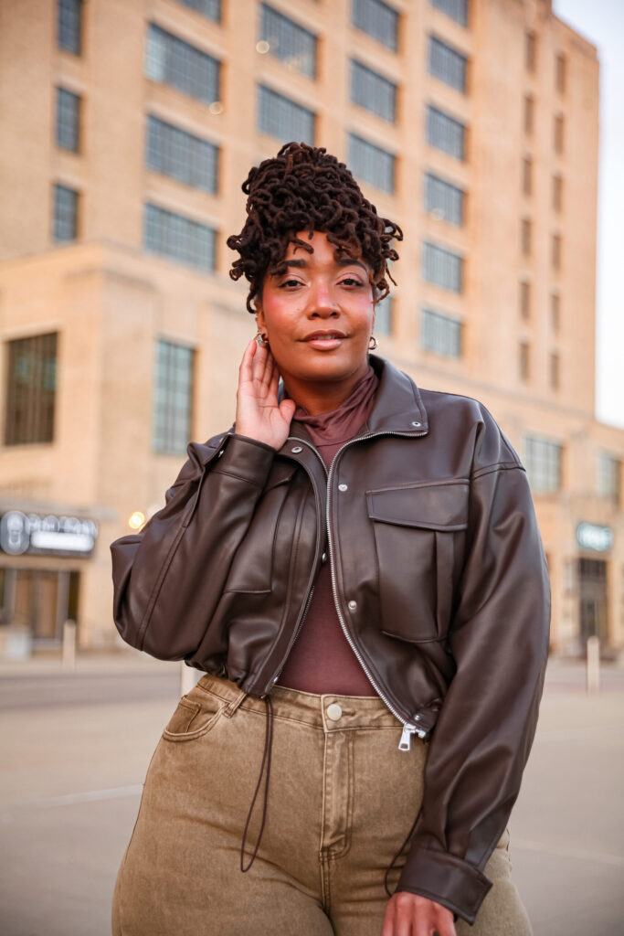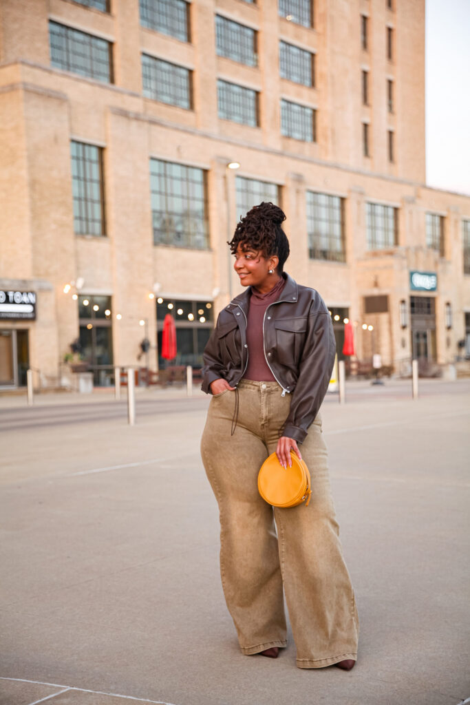 This outfit truly came together piece by piece. I knew I didn’t want to default to black, so I leaned into chocolate tones instead. I instantly fell in love with the faux leather chocolate jacket, then layered it with a chocolate turtleneck for a rich, tonal moment. To finish the look, I added a mustard-colored handbag worn as a clutch for the perfect pop of contrast.