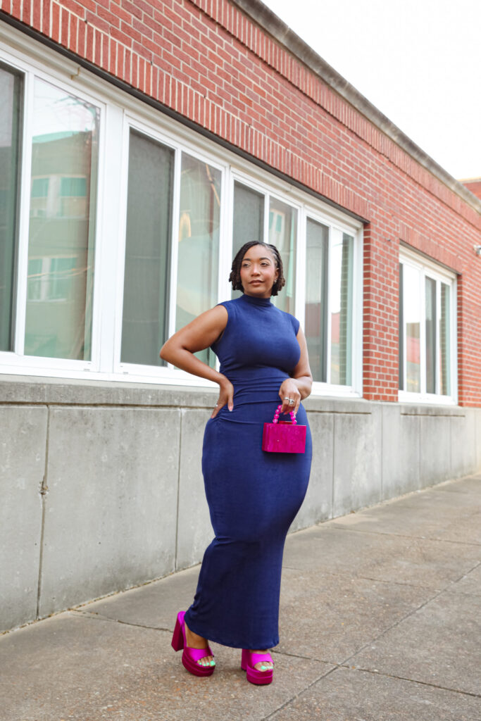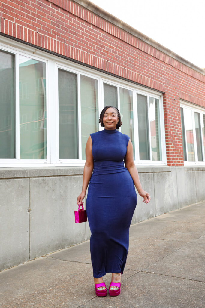 Styling this navy dress could have gone in so many directions. The easy choice would’ve been gold—classic, safe, and always a go-to. But Curvies… I wanted to do something a little different. I looked around my closet and these purple platforms immediately stood out. And this time? They weren’t just along for the ride, they were the moment.